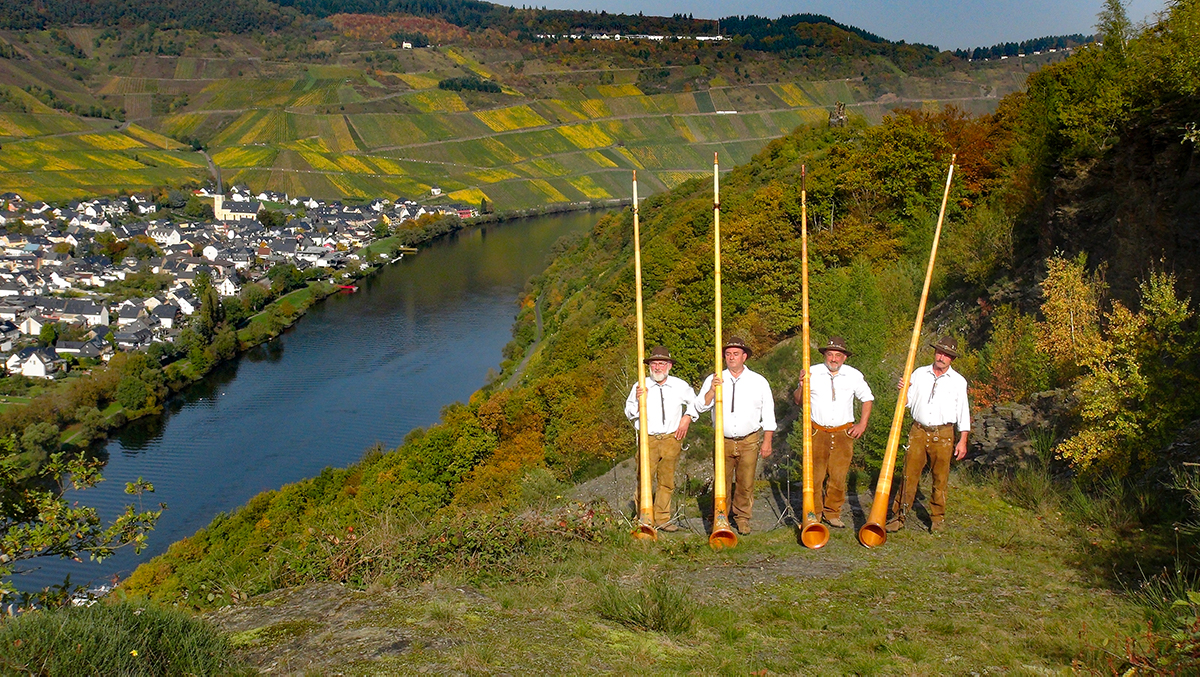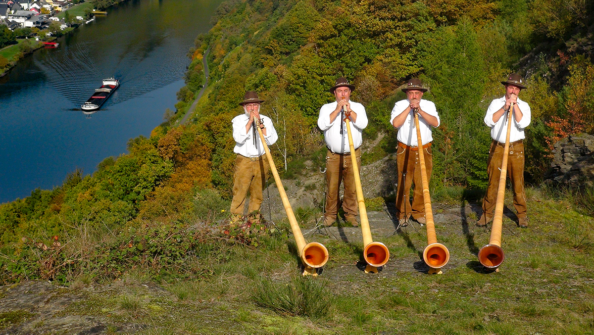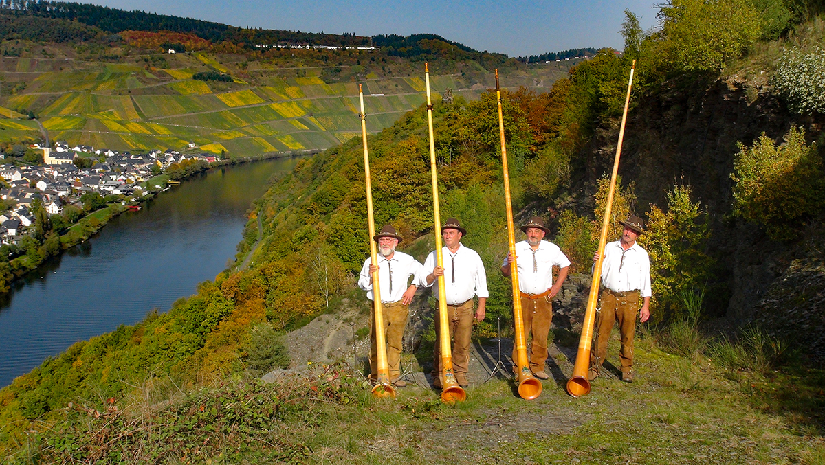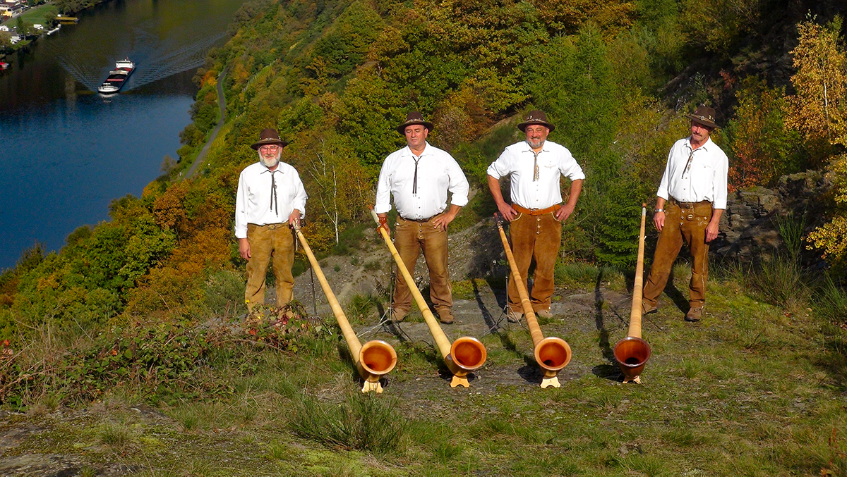 Die Moseltaler Alphornbläser mit ihren Alphörnern bringen das musikalische Flair in den Hunsrück, die Eifel und das wunderschöne Moseltal.